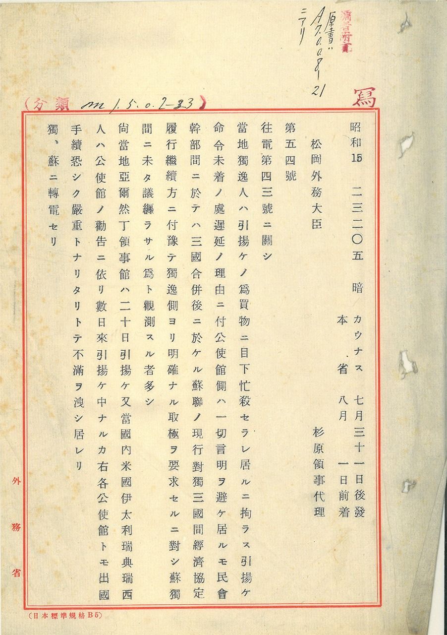 第54號杉原電報(在考納斯給難民簽發簽證的第6天,即1940年7月31日發出,外務省提供)