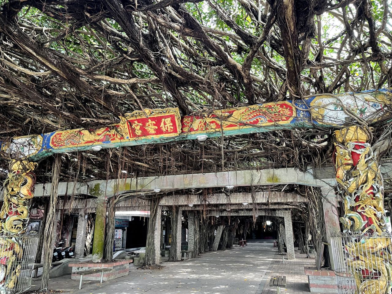 通樑古榕,受到冬季東北季風影響,大樹枝葉皆偏向西南方生長。據說此樹種於1673年