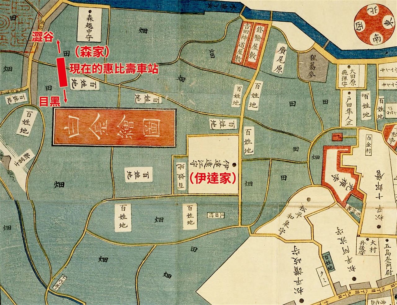 《江戶切繪圖 目黑白金邊圖》裡可看出大名宅邸與惠比壽車站的地理位置關係。國立國會圖書館館藏
