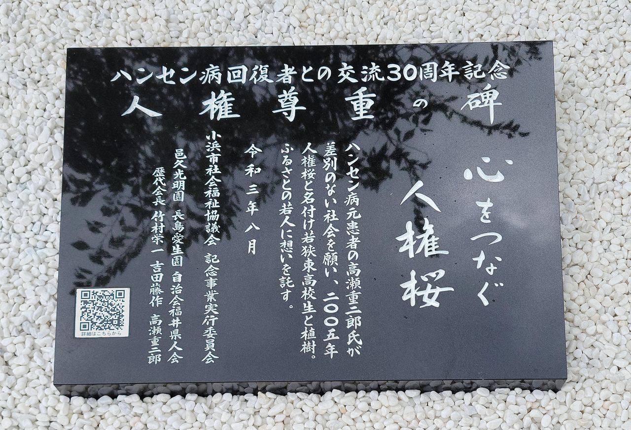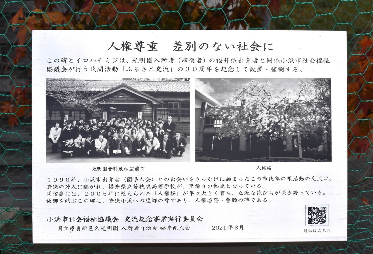 2021年8月,邑久光明園設立刻有「尊重人權 促成沒有歧視的社會」等字的標示牌。進入該園的福井縣出身者與同縣小濱市社會福祉協議會,一直在做「故鄉交流」,這塊標示牌就是用來紀念此活動已滿30週年。福井縣立若狹東高中從2005年開始涉足交流事業,他們也在2021年8月設立「尊重人權之碑」。