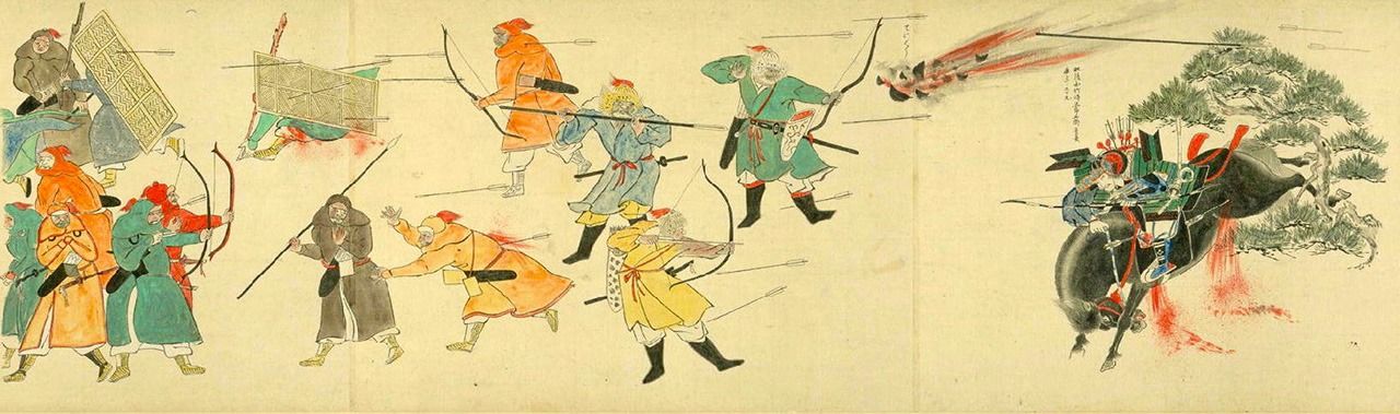 在有名的《蒙古襲來繪詞》(*1)裡面,也描繪了雙方在鳥飼濱交戰的情形。元軍士兵用短弓攻擊,肥後國(現在的熊本)御家人竹崎季長則是騎在馬上拉弓射箭,命中敵人,但是馬被敵人的箭刺中流血。甚至,由於元軍的火器「鐵砲」(日文為「てつはう」)爆炸,竹崎的馬受到驚嚇而失控亂竄。