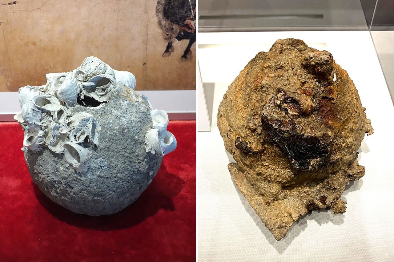 「鐵砲」(左)、元軍的頭盔(右),長崎縣松浦市立埋藏文化財中心(筆者攝影)