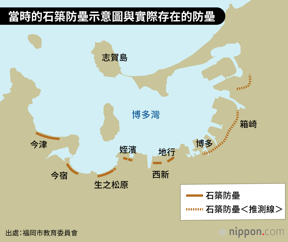 此外,位在博多灣西部的「今津防壘」,與「生之松原」相比,石牆較厚,形狀也不同。防壘是鎌倉幕府發號施令建造,僅在半年內就迅速完工,所以九州各地的御家人全數被動員起來。生之松原是肥後國建造的,而今津是由大隅國(現在的鹿兒島)和日向國(現在的宮崎)負責的,在構造上出現差異。
