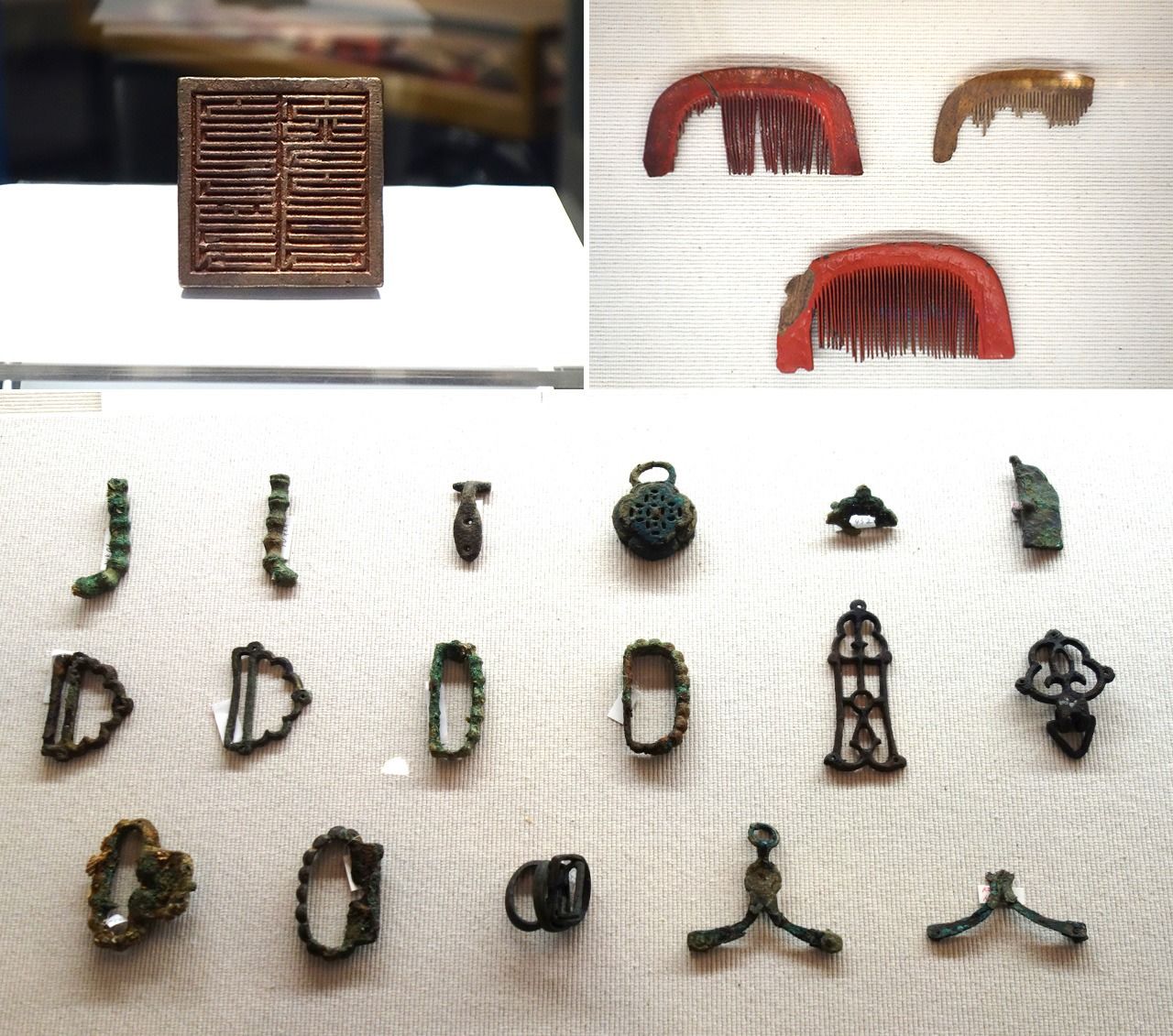 (左上)在鷹島神崎港挖蛤蜊的人發現「管軍總把印」,上面刻著蒙古文字,屬於中級將領的物品。(右上)朱漆木梳。可一窺船上生活的痕跡(下)元軍士兵配戴的腰帶上會繫銅製裝飾品,並且懸掛佩刀=均拍攝於長崎縣松浦市立埋藏文化財中心(筆者攝影)