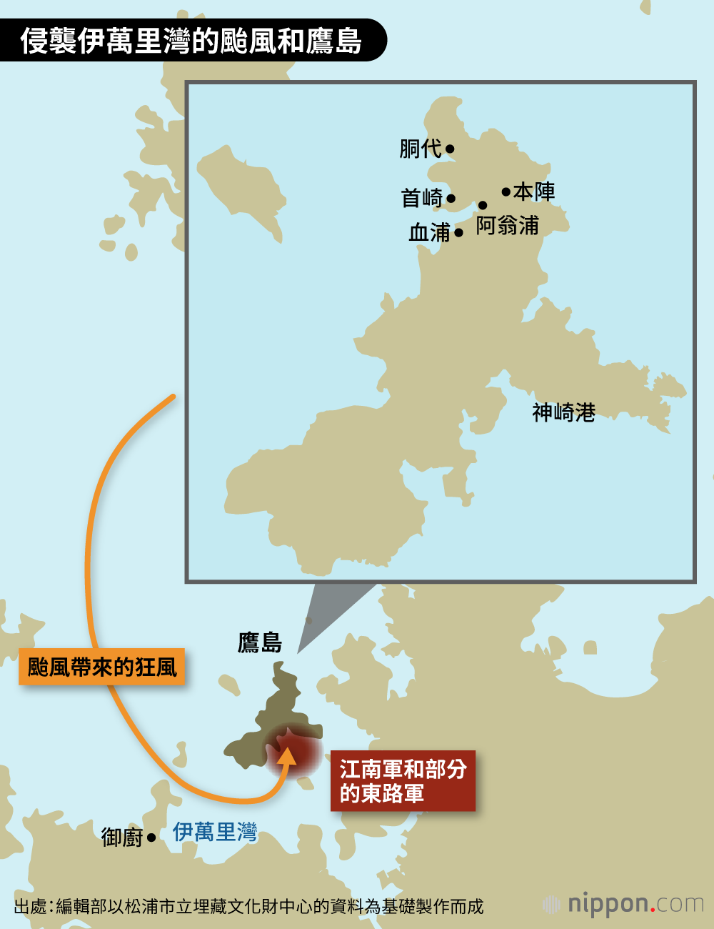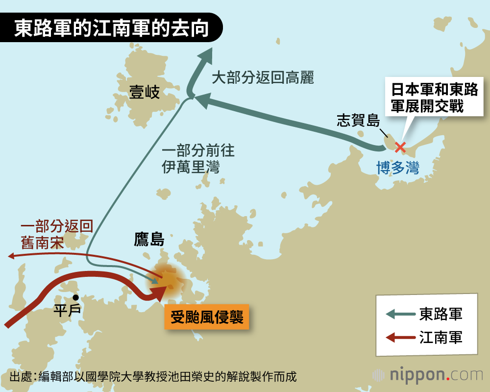 實際上,姍姍來遲的江南軍也沒去到博多灣,好不容易抵達了伊萬里灣之後,卻遇上颱風失去音訊。