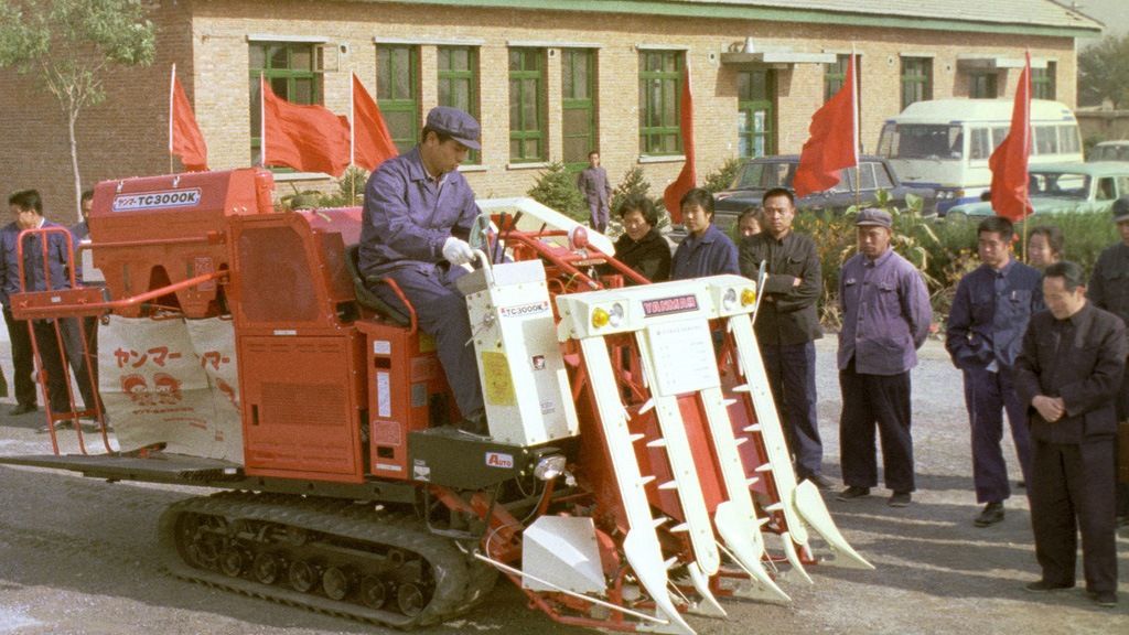 標題圖片:一名社員在人民公社的成員面前,操作由日本製造商(洋馬)捐贈的聯合收割機,1974年11月,北京市郊外的中日友好人民公社(共同)