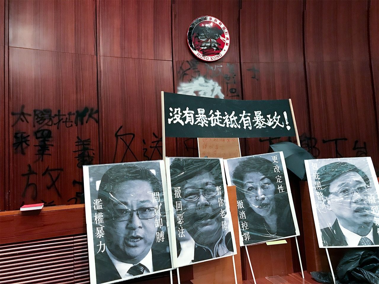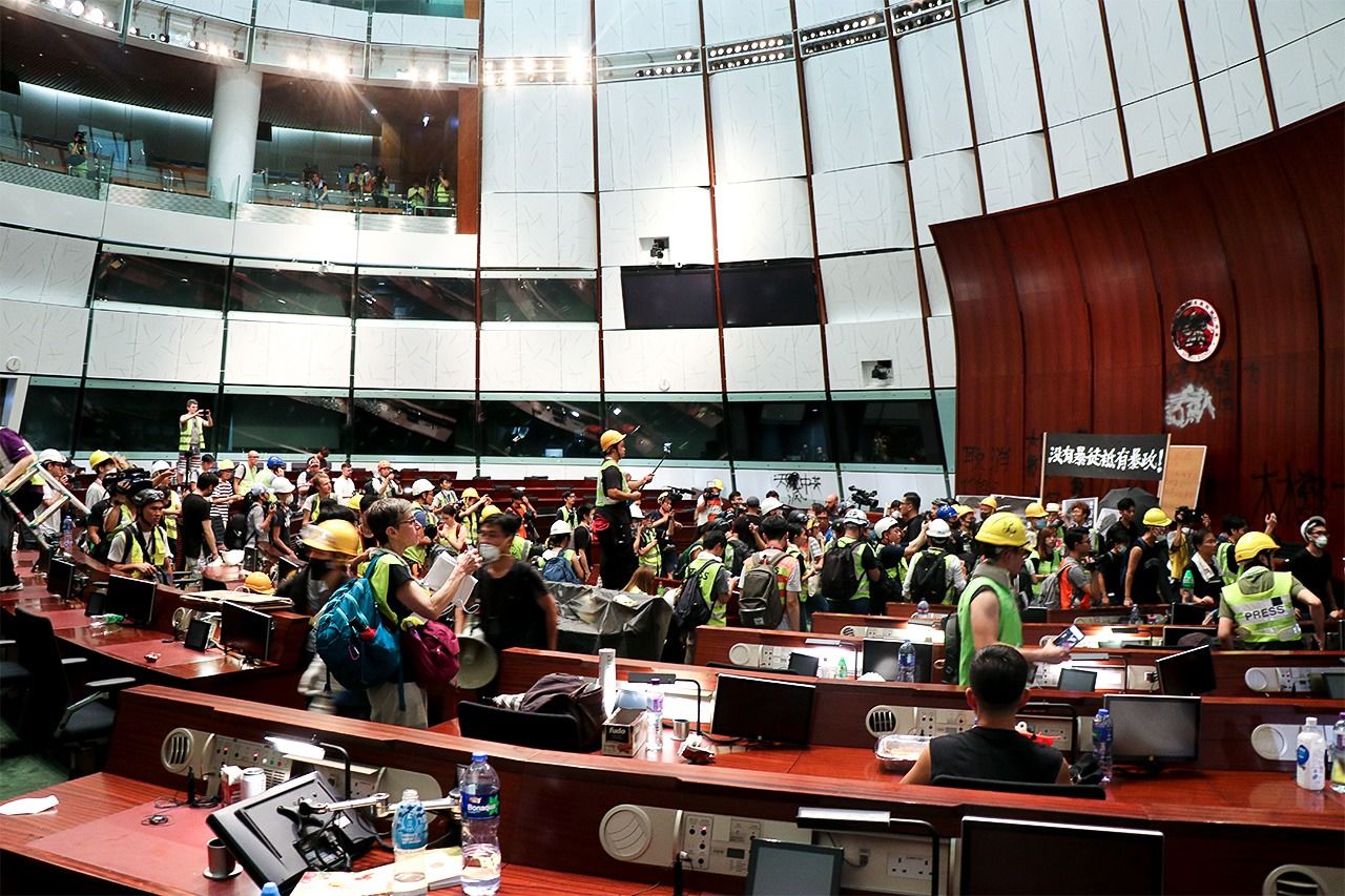 立法會內部的現場一片凌亂,香港金紫荊圖樣被噴上了黑漆,議事臺上放著林鄭月娥為首的四個長官頭像,上面橫幅寫著「沒有暴徒祇有暴政」。偌大的議事殿堂因為沒有空調而顯得悶熱,還有股淡淡地刺鼻味,警鈴因為被破壞一直發出響聲,許多抗議人士不斷進進出出,搬進許多物資一度打算長期抗戰。