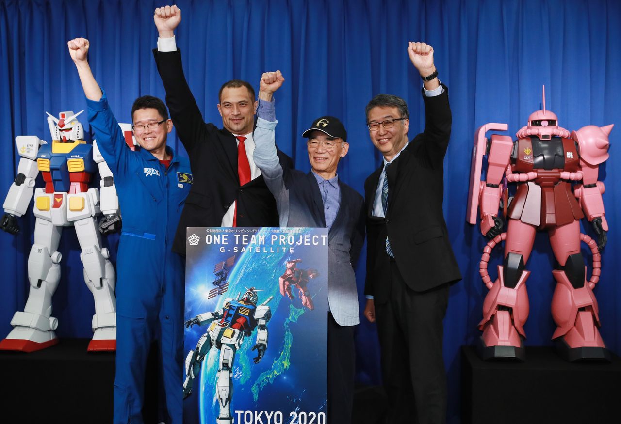 「G-SATELLITE 飛向宇宙」專案記者會的最後,富野由悠季導演(左3)等人高舉拳頭,鼓舞士氣。2019年5月15日,東京都千代田區(時事)
