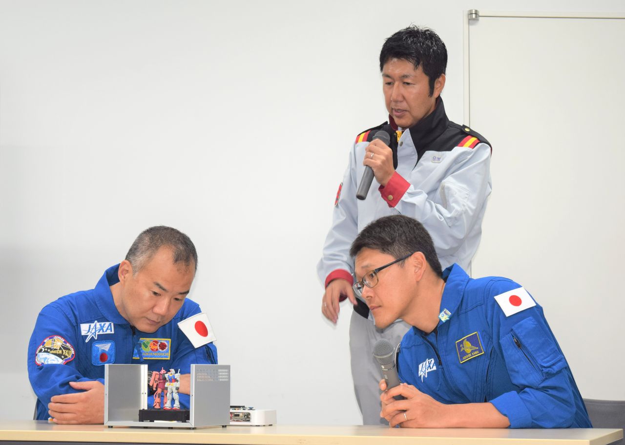 野口聰一和(前左)和金井宣茂(前右)在看將裝載在「G-SATELLITE 飛向宇宙」專案的人工衛星中的鋼彈模型,2019年9月4日,静岡市葵区(時事)