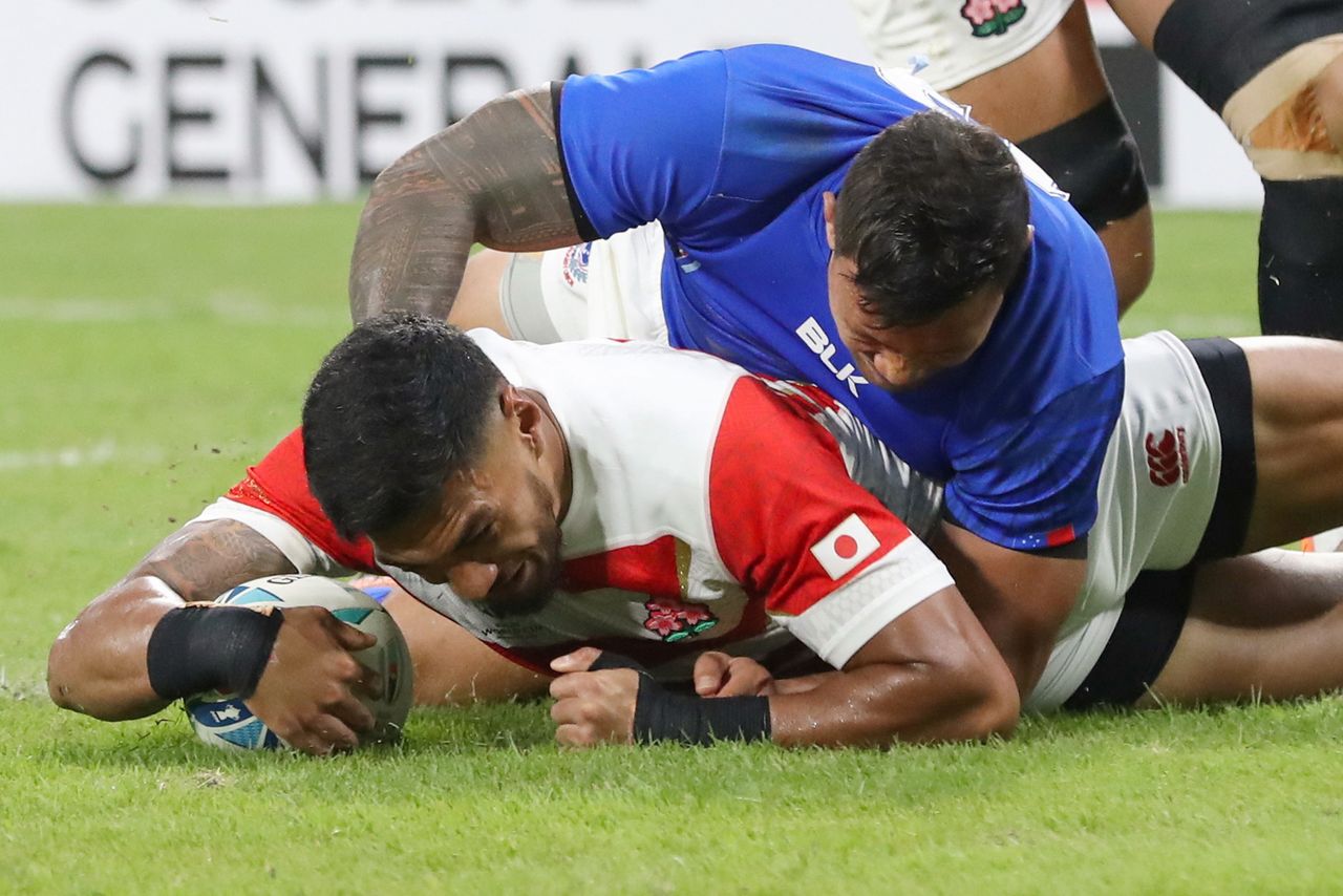 迎戰母國薩摩亞時完成觸地得分,帶給日本勝利契機的提摩西‧拉法爾(2019年10月5日,愛知縣豐田體育場,時事通信社)