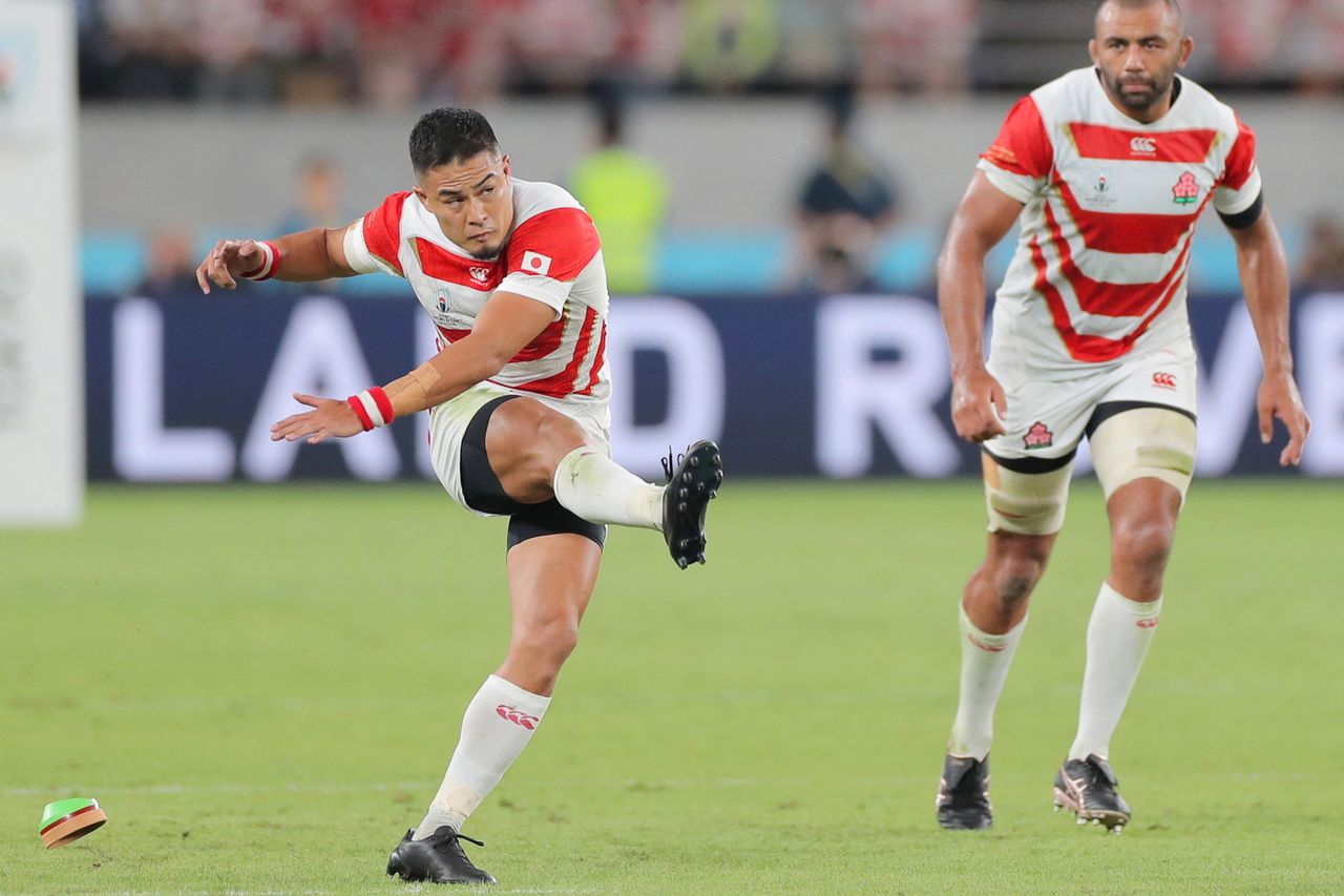 分組賽裡得分數第1名的田村優的踢擊,或許便是對上南非時的勝負關鍵(2019年9月20日,東京體育場,時事通信社)