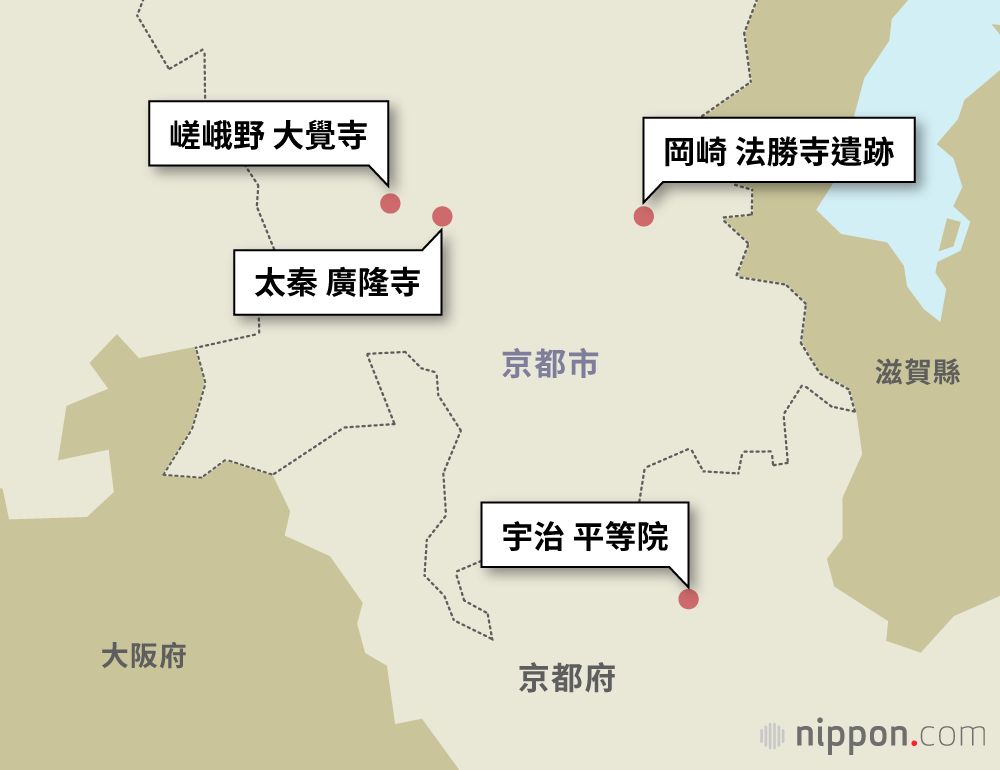 古代來自大陸的渡來人的活動據點在太秦,這裡有因彌勒菩薩像而聞名的廣隆寺,嵯峨野有嵯峨天皇的離宮改建而成的大覺寺。現在,文化設施雲集的岡崎是從白河天皇建立的法勝寺所代表的寺院群發展起來的。