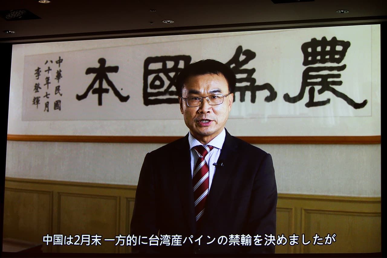 農業委員會陳吉仲主任委員以視訊形式向來賓問候,2021年3月30日,於東京都內飯店舉辦的「臺灣鳳梨以及鳳梨加工品發表會」上播放(編輯部攝影)