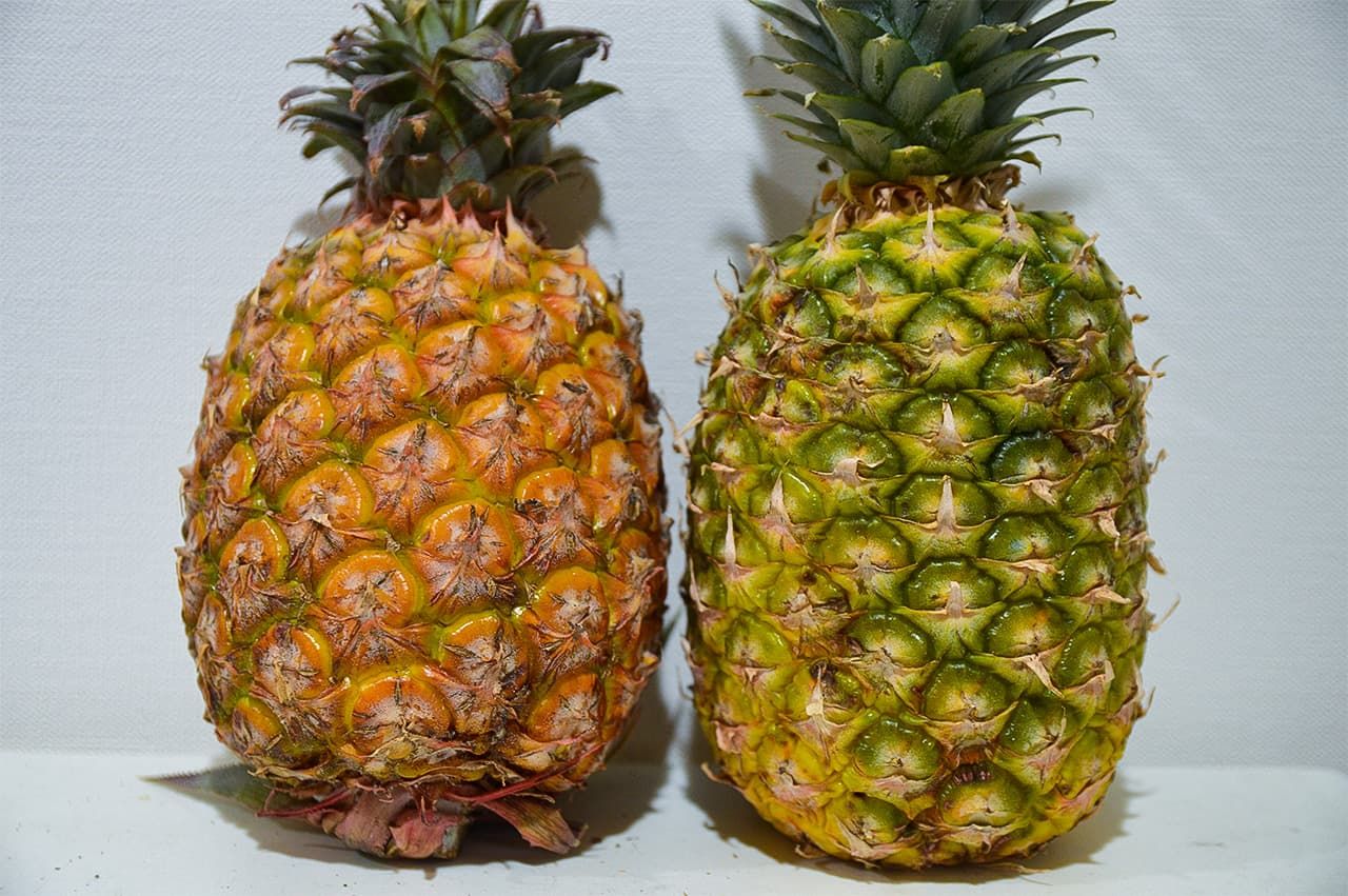 這張照片是與菲律賓鳳梨的外觀比較。菲律賓鳳梨外形就如一般想像的鳳梨形狀,相比之下,臺灣鳳梨較小顆,也有獨特的顏色和外形。