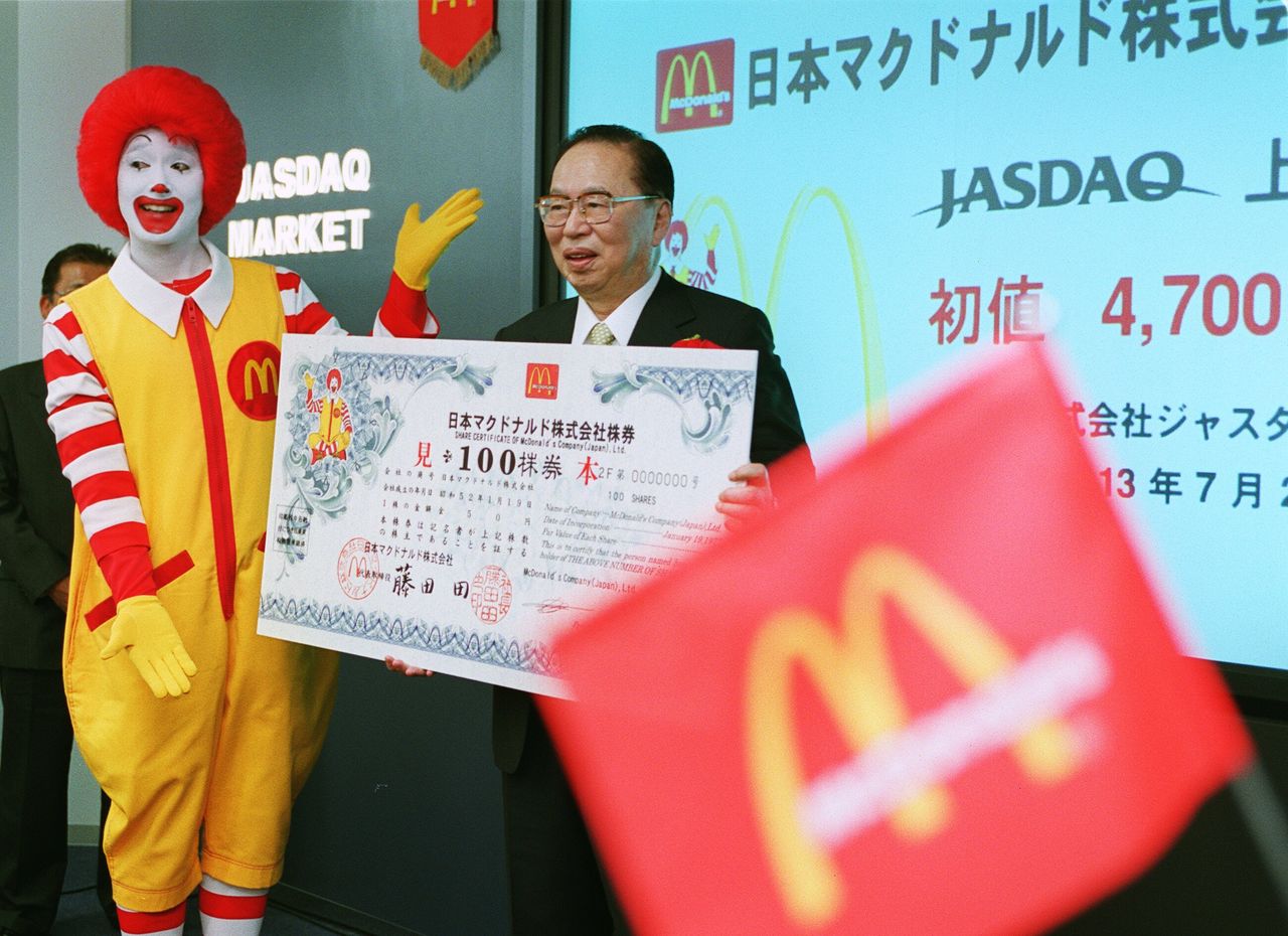 2001年7月26日,日本麥當勞公司在JASDAQ上市。在東京都中央區證券會館舉行的上市儀式上,藤田田社長和公司的吉祥物麥當勞叔叔一起向公眾展示股票(時事)