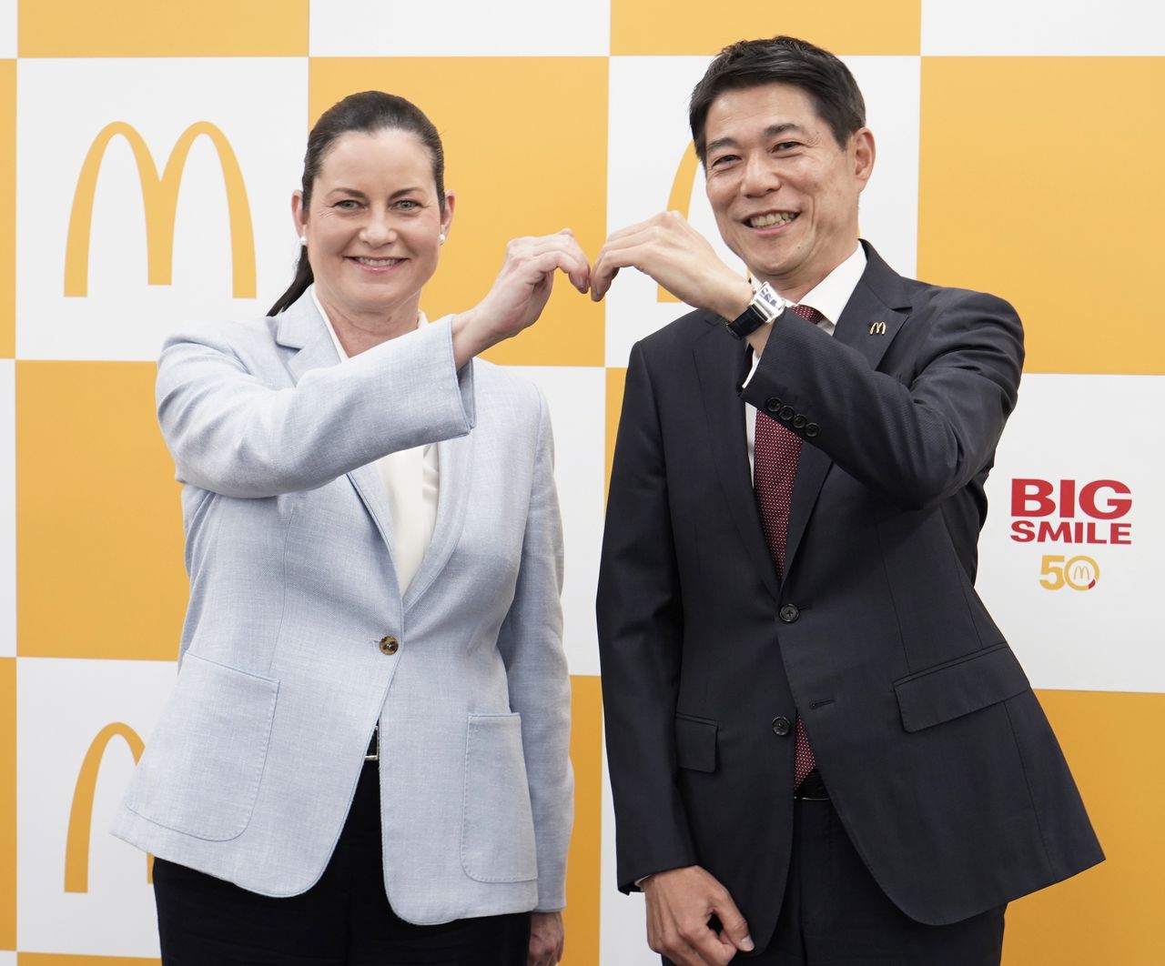 2021年2月19日,日本麥當勞控股公司時任社長薩拉·卡薩諾瓦(左)和即將接班的繼任社長日色保董事,在東京都新宿區的公司總部合影(日本麥當勞公司/時事)