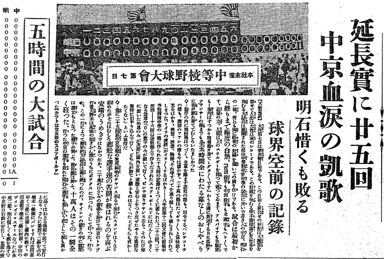 對中京商和明石中來說都是好投手互投的緊迫危急之戰。記分板上,0這個數字連續並排,比賽也延長又延長。共可記16局的記分板上全部被0所填滿。急忙找來木工,將原木組裝後,填寫上17局及之後的延長賽局。到了日頭西斜就快要迎接日落的時刻,若還是無法定出勝負的話,只好隔日再戰。所有選手都是極為困倦疲乏的狀態,更想避免隔日再戰的情況。如此極限狀態下,終於中京商得到1分獲得了勝利。這場比賽誠然延長到25局。而這25局完全由負傷的吉田1個人所投,共投了336球,比賽時間長達4小時55分。