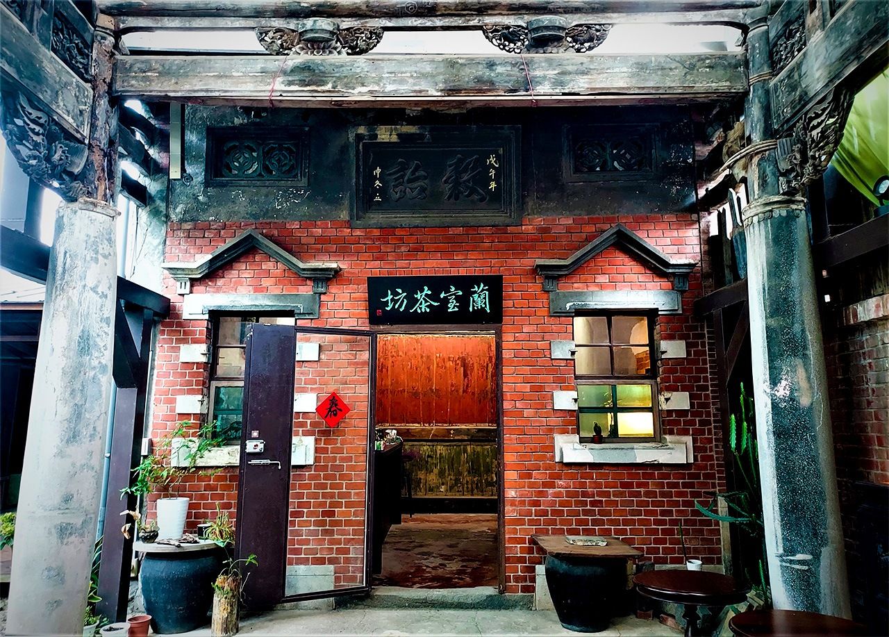 筆者前往「新南12」對面的「蘭室」,這是一棟文人風的風雅建築,外觀為紅白色調的「辰野式」,細長房屋延伸至裏側,並掛有匾額,還有中庭。這裡是由臺車軌道「桃崁輕便鐵道會社」創始人,同時也是當地名士的呂鷹揚於1918年所建。呂鷹揚之子呂鐵州曾就讀京都繪畫專門學校(現京都市立藝術大學),師事福田平八郎,為活躍於日本時代的知名臺灣畫家。筆者不禁感慨萬千:或許呂鐵州的美感,他那纖細而遒勁的構圖能力,便是在這樣優美的環境裡培養出來的。