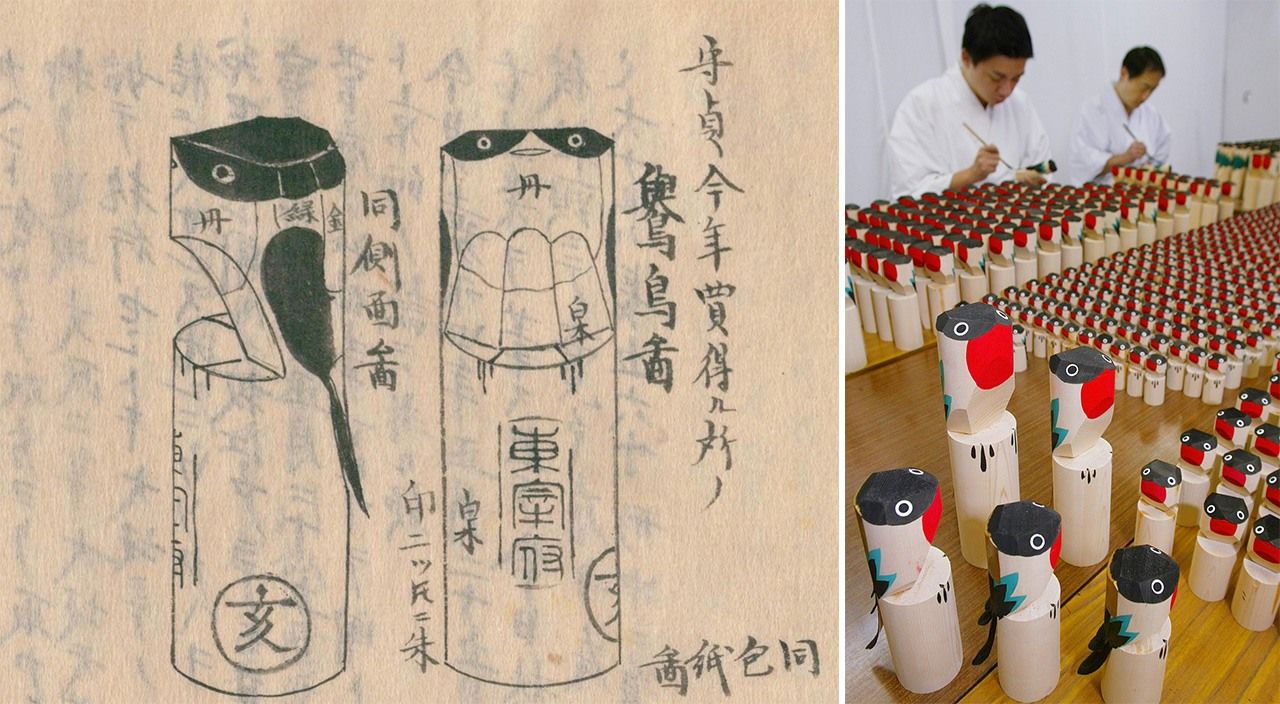 (左)守貞在龜戶天神買的「木鴬」。白木雕刻,眼睛和羽毛都是黑色,喙是朱紅色,側面是綠色,腦後部施以金色裝飾。(右)工匠在雕刻龜戶天神的「木鴬」。基本保持了守貞當年買的木鴬的外觀