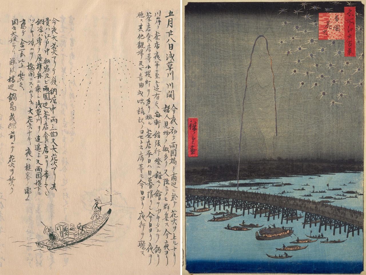 (左)守貞所繪隅田川花火。雖然只有一艘船,但船上的煙花師傅卻畫得細緻,聚焦在「人」的身上。(右)《名所江戶百景 兩國花火》(廣重畫,安政5年,即1858年,國立國會圖書館藏)中畫了遠處數艘船隻、橋樑還有群眾