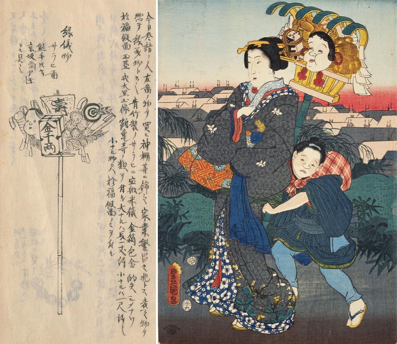 (左)守貞所繪的熊手。這是大號的,有1丈長(約3.03m)。可見寶舟、米俵、千兩箱、御福面等裝飾物。(右)《十二月之內 霜月酉之町》(豐國繪,安政元年(1854年),國立國會圖書館藏)。讓少年幫助運送熊手的女性