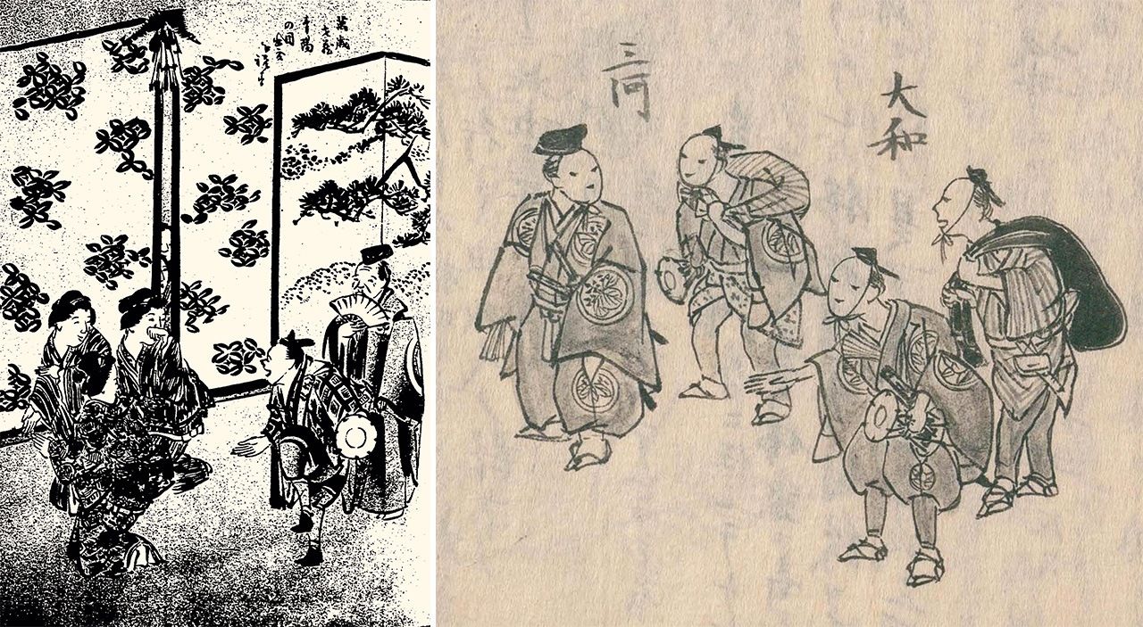 (左)《江戶府內繪本風俗往來》(國立國會圖書館藏)的三河萬歲,大搖大擺地住進了人們家中。(右)左邊為三河萬歲,右邊為大和萬歲的組合。大和(現在的奈良縣)的萬歲據傳歷史比三河的更悠久,主要是在上方一帶表演