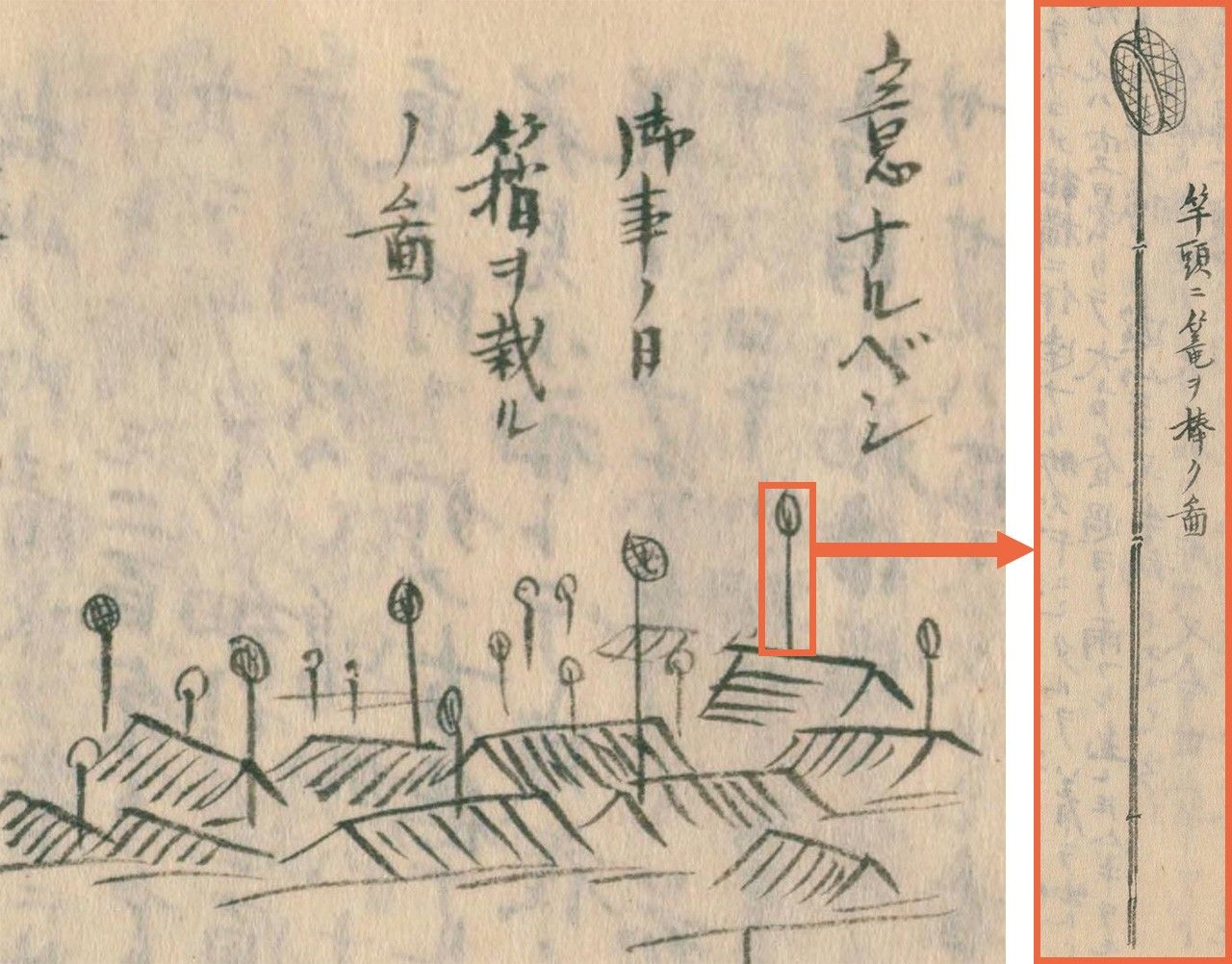 (左)御事始時,頂端掛著筲箕的竹竿如雨後春筍般林立;(右)竹竿和筲箕的詳細圖图