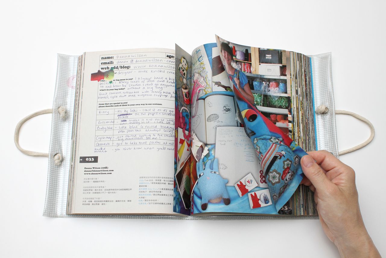 《私囊Me in my bag》一書分享100個人的袋中世界。書籍被設計的像是個有把手的包包。2007年出版。