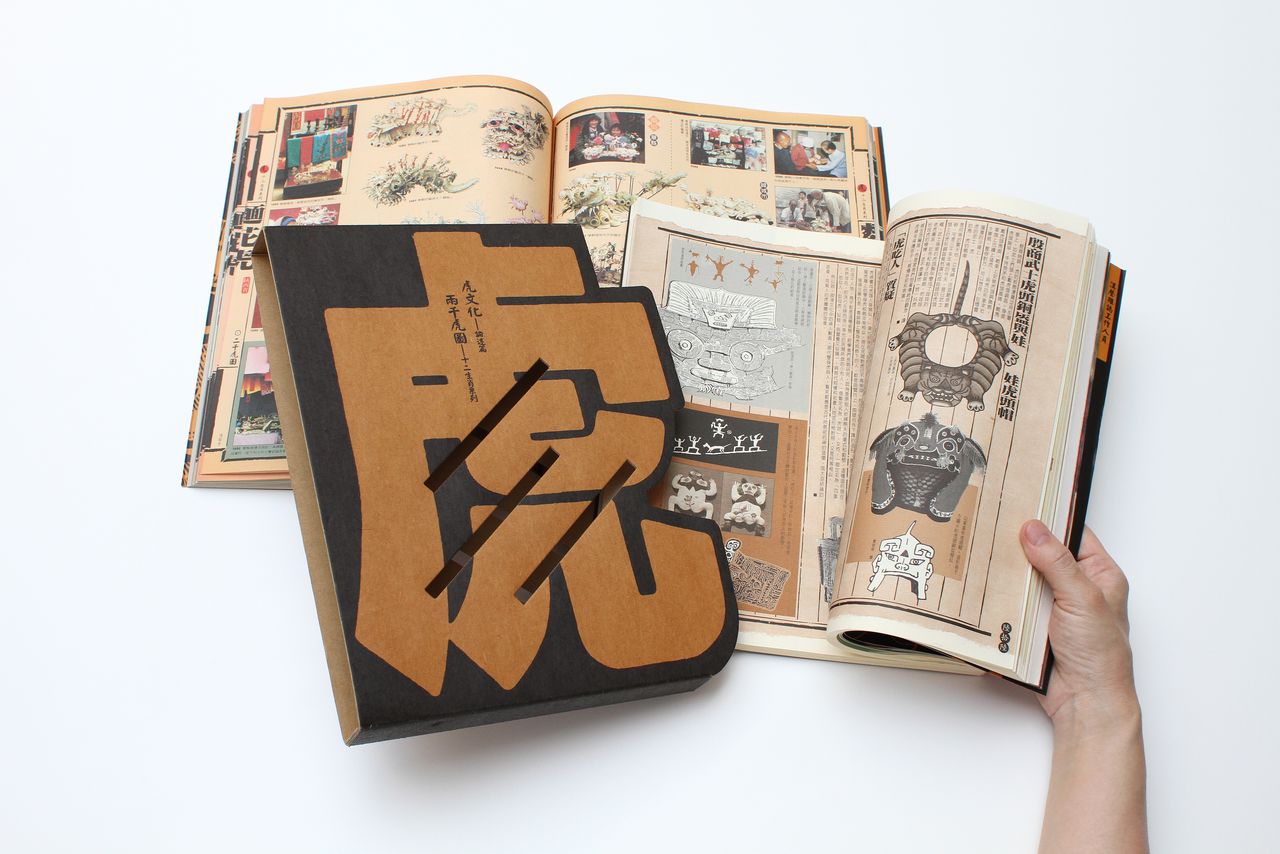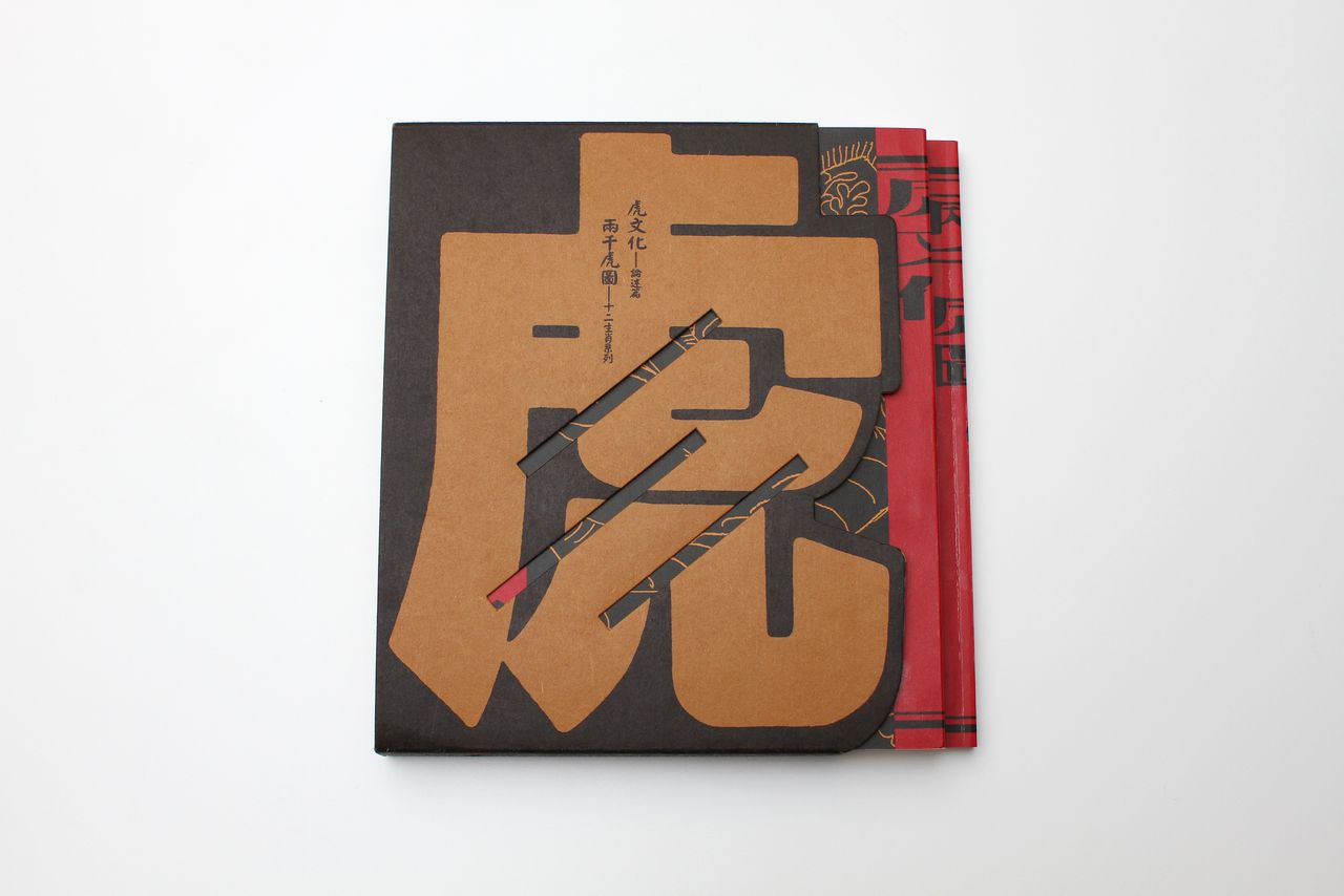 同樣是漢聲巷出版的書籍《虎文化》,扎實穩固的書封上「虎」一字被割劃了幾爪。該書網羅中華文化圈裡以虎作為題材的工藝品相關資訊,簡單明瞭地介紹該工藝品們如何為生活添色。從傳說到被神格化,作為吉祥象徵的老虎被施以鮮豔色彩,極為特別。內容中也不意外地詳細解說著工藝品的製作過程,那深遠又寫實的紀錄也挑戰著讀者的專注力。