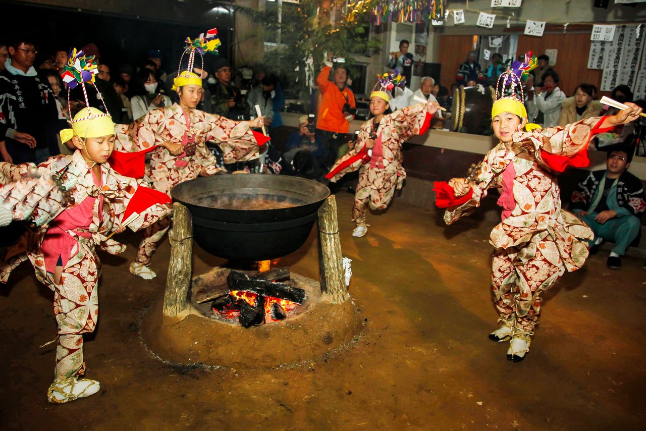 愛知縣奧三河地方的14個地區,有七百年前傳承至今的湯立神樂「花祭」,祭典會從稚子在深夜開始表演「花之舞」開始。在日本的祭典中,據說神明會降身的稚子,通常都是「未滿10歲的男孩」,因此花之舞一直是住在當地的年幼長男擔任。然而,東榮町御園地區只有34戶人家,從20多年前開始,讓外地的孩子參加。在這樣的情況下,御園時隔10幾年,終於有孩子出生。她們雖然是一對女雙胞胎,但4歲就以稚子之姿亮相,成為參觀者的偶像。如今,擔任花之舞的孩子男女都有。