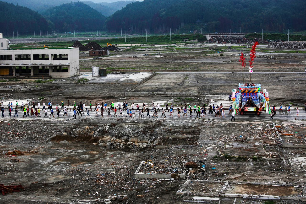 受到17公尺高的海嘯襲擊的岩手縣陸前高田市,則是舉辦盂蘭盆祭「行動七夕祭」。由5000名志工同心協力,及時修復被埋在泥淖中的山車(巨大的彩飾花車),並誠心祈求:「各位祖先,城鎮雖然被沖垮了,但還請祢們歸來。」