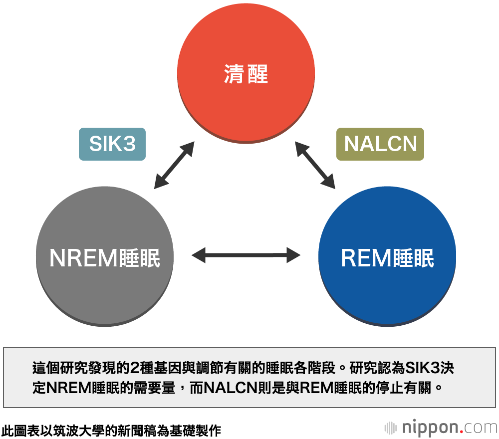 另一方面,「Nalcn」基因有變異的小白鼠家族,REM睡眠急遽減少。睡眠具循環性,REM睡眠與NREM睡眠(非快速動眼期)交替出現。REM睡眠是指身體即使進入睡眠,大腦依然積極運作的狀態。Nalcn有可能是製造影響NREM睡眠與REM睡眠交替的蛋白質,有助於首次解開具有切換功能(switching)的細胞內結構,備受期待。