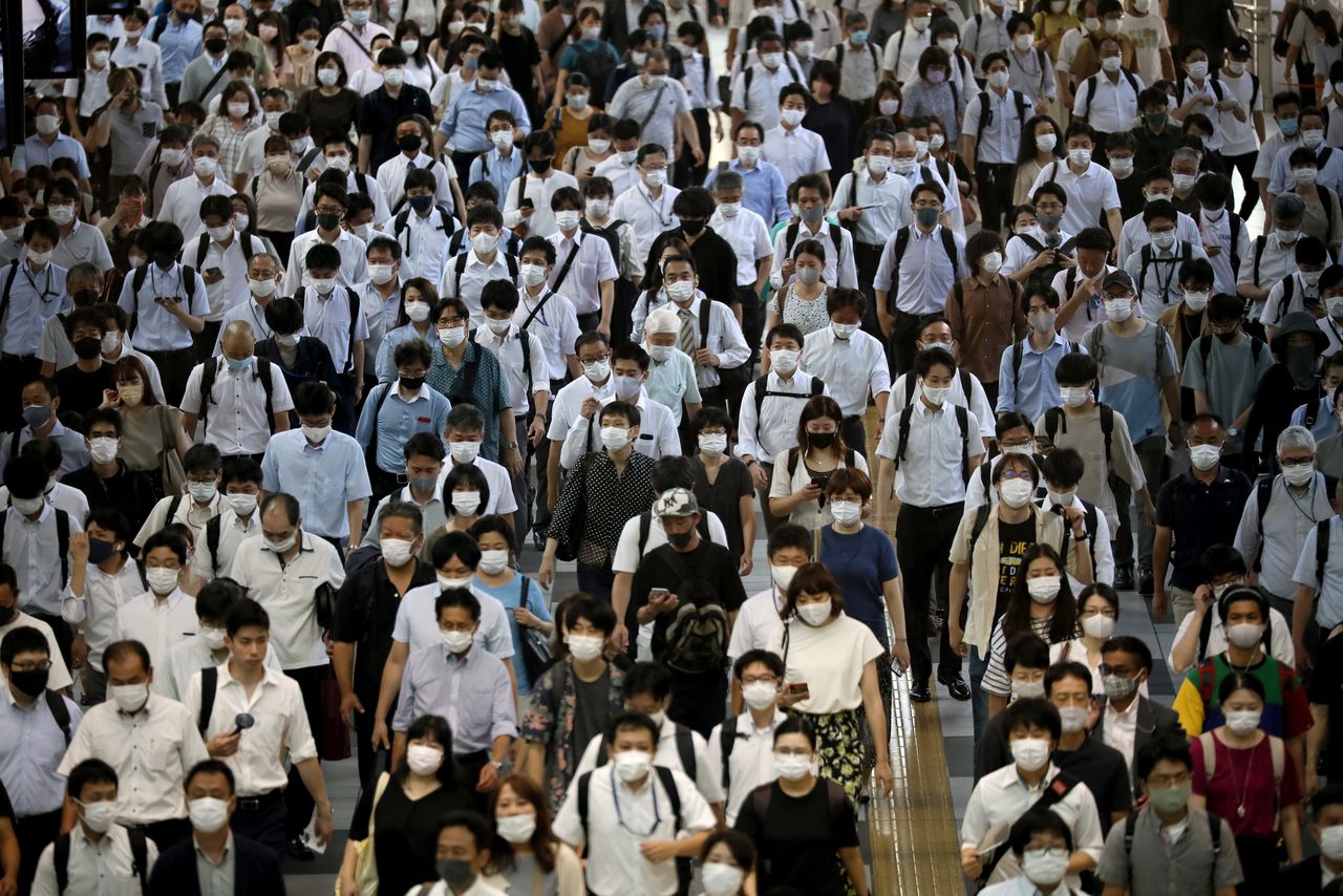 東京都在19日,再度公布新增5534人新型冠狀病毒確診。照片為2日在東京都内攝影,穿戴口罩通勤上班的人們(2021年 路透/Kevin Coombs)