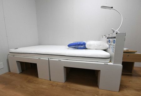 向媒體團公開的東京奧運・帕運選手村居住建築房間的「瓦楞紙箱床」=6月20日、東京都中央區