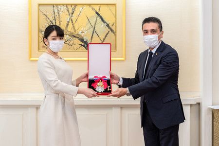 從駐日巴拉圭大使手中領受勳章的秋篠宮家長女真子內親王=5日下午、於東京都港區赤坂東邸(宮内廳提供)