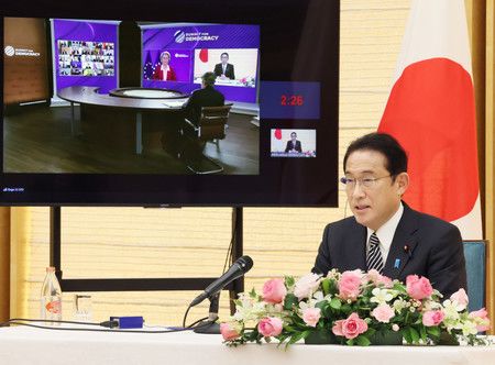 日本首相岸田文雄在9日,以網路形式參加美國政府主辦的民主主義高峰會並發表演說,他並表示「在損害自由、民主主義、法律支配的基本價值上行徑,我們要與有志國一致合作。對深刻的人權侵害上要切實地發出聲音」。對於中國在新疆維吾爾自治區的人權侵害等為引子,希望能與美國共有普世價值等,展現日方姿態。