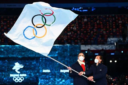 閉幕式上承接奧運旗的米蘭與科爾蒂納丹佩佐代表=20日、北京(AFP時事)