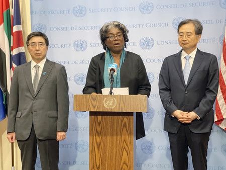 26日、位於紐約的聯合國本部,在安保理事會後閱讀聲明的美國駐聯合國大使湯瑪斯‧格林斐德(中央)及日本駐聯合國大使石兼公博(左)
