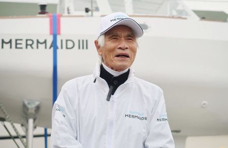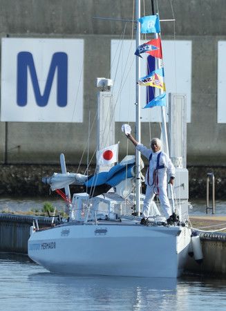 世界最高齡駕駛遊艇,挑戰無靠港橫渡太平洋的海洋冒險家堀江健一(83歲)=兵庫縣蘆屋市,4日凌晨如願抵達他所設定的終點,和歌山縣日之御崎海域。