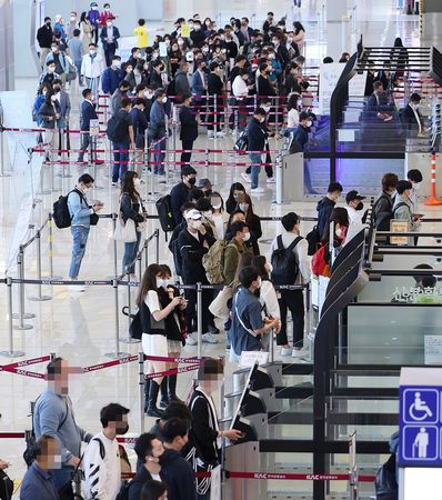 搭乘旅客相當熱鬧的金浦機場出發口=4月29日、韓國・首爾(EPA時事)