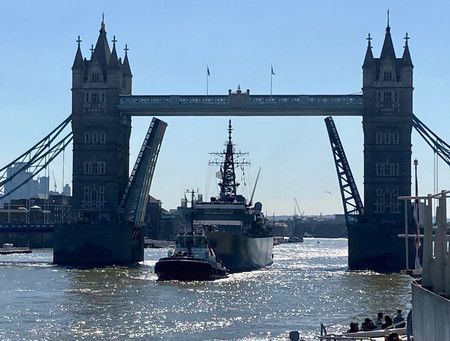 從泰唔士河上的倫敦鐵橋經過的海上自衛隊練習艦「鹿島」(中央)=22日、倫敦