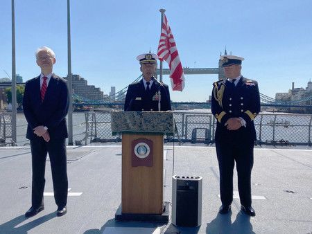 在海上自衛隊練習艦「鹿島」艦上舉行記者會的練習艦隊司令官小牟田秀覺(中央)=22日、倫敦