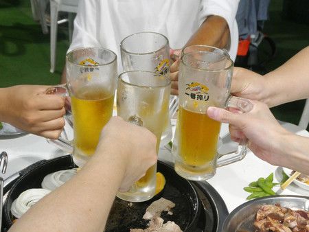 在明治神宮外苑内「森林啤酒花園」內乾杯的公司職員們=22日、東京都新宿區