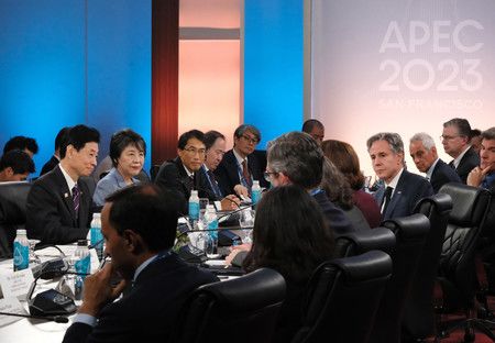 經濟產業大臣西村康稔(後左)及外務大臣上川陽子(左二)出席日美經濟政策協商委員會(經濟版2+2)工作小組會議=14日、美國舊金山