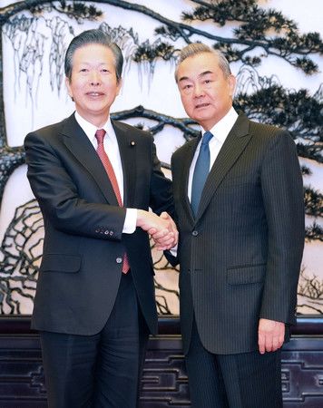 公明黨代表山口那津男與中共中央政治局委員、外交部長王毅(右)握手=23日、北京人民大會堂(代表攝影・時事)