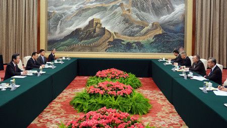公明黨代表山口那津男(前左)與中共中央政治局委員、外交部長王毅(前右)會談=23日、北京人民大會堂(代表攝影・時事)