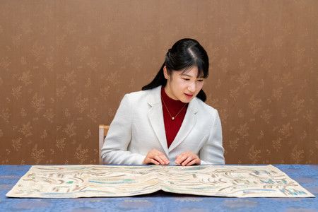 天皇與皇后的長女愛子內親王正在欣賞室町時代的《百人一首》手稿=11月24日、皇居内宮内廳書陵部(宮内廳提供)