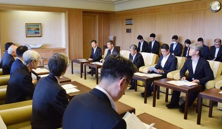 防衛省政務官松本尚(中排後方)向山口縣知事和當地首長等說明美國海軍魚鷹部署到岩國空軍基地的情況=15日下午、山口市