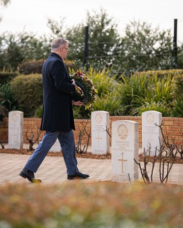 澳洲總理艾班尼斯,4日在澳洲東南部考拉的戰爭公墓敬獻鮮花(澳洲總理府提供・時事)