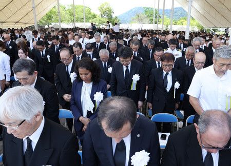 原子彈爆炸倖存者、死者家屬、日本首相岸田文雄以及來自包括核武國家在內,共有破紀錄的100個國家的代表出席儀式。今年除了俄羅斯和白俄羅斯之外,以色列也沒有受到邀請,但七大工業國(G7)中除日本外的其他六個國家都對此表示反對。六個國家駐日大使都缺席,給祈和平儀式蒙上陰影。